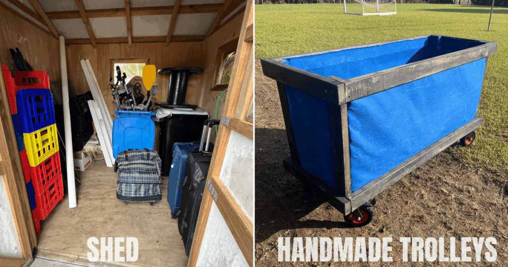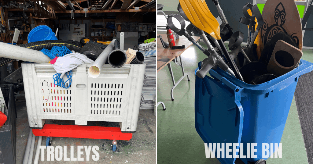 At Junky Monkeys, we use trolleys with wheels on them to store and move our junk around easily. Some schools have adopted this idea, storing trolleys at the back of PE sheds.